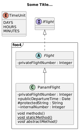 Some Title...foo4Flight-privateFlightNumber : IntegerPanamFlight-privateFlightNumber : Integer+publicDepartureTime : Date#protectedString : String~internalNumber : Integervoid methods()void staticMethod()void abstractMethod()TimeUnitDAYSHOURSMINUTESIFlight
